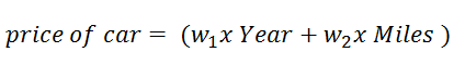 이 예시는 차 가격과 생산연도 사이에는 긍정적 관계가, 차 가격과 운전키로수 사이에는 부정적인 관계가 있음을 보여줍니다. 결과적으로 우리는 생산연도에 양의 가중치를 , 운전키로수에는 음의 가중치를 기대할 수 있습니다.
