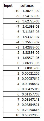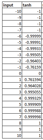 아래의 표는 앞으로 설명할, 가장 잘 알려진 5가지 활성화 함수의 값이 어떻게 다른지 나타냅니다. 각 함수는 입력을 변환하는 고유의 공식을 가지고 있습니다.