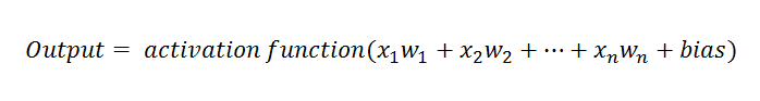 마지막으로 계산된 값은 활성화 함수로 넘겨지고 활성화 함수는 출력을 만들어냅니다.